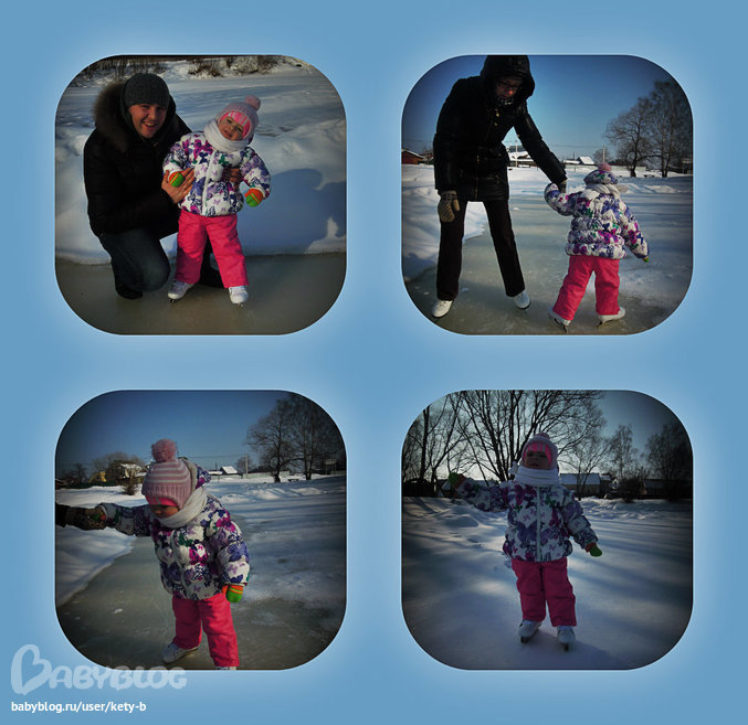 Все прошло успешно, весело, без падений (т.к папа страховал). Самостоятельно передвигаться на льду пока не получается, но стоять, ходить и кататься за ручку Даша уже освоила. Ура!!!
