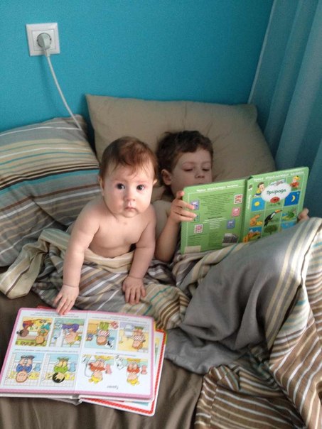 Пока готовила на кухне, Эмиль притащил книги и они просвещались с сестрёнкой)))) Тихо-тихо сидели... Читали))))