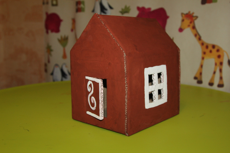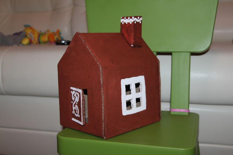 Мой муж в миг вырезал из коробки( 5 слойный картон) домик, он состоит из 3-х частей. Две боковины, а центральная она единая с перегибами. она же и дно и крыша и обе стены.