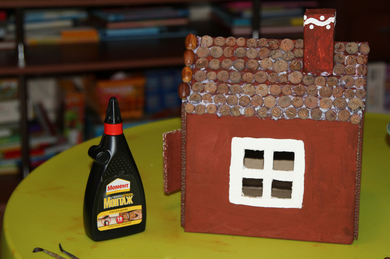 Сначала не было желания творить поделку на тему "Осень", но идея как то быстро родилась и мы решили сделать Осеннюю избушку из желудей.