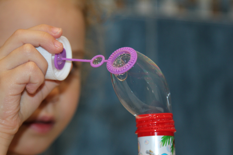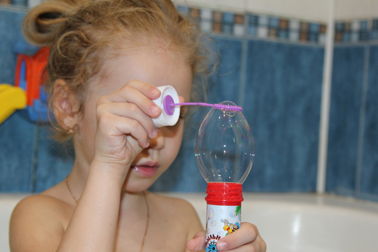 Дома я им не разрешаю пускать где попало, иначе пол скользкий и все падают, в общем надувают пузыри они сидя в ванной.