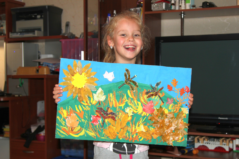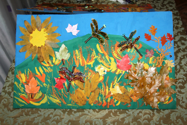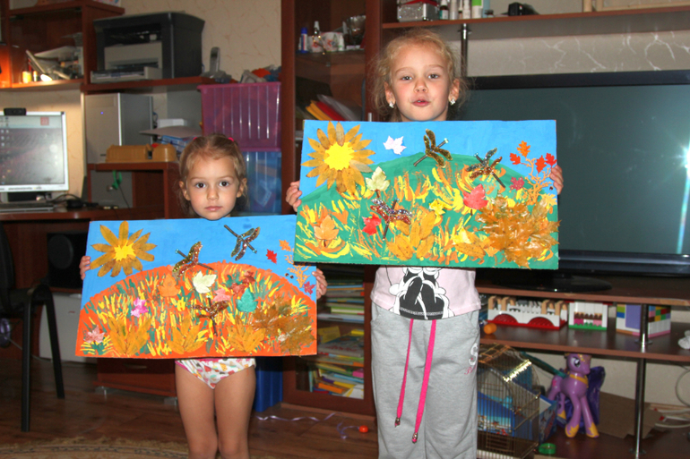 Я сделала стрекоз, это целый геморрой приклеить бусинки, как глаза- моментом, приклеить кленовые вертолетики))) а потом я их пришила на их поделку.