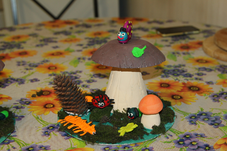 Дети тем временем из теста для лепки смастерили насекомых, листики)) Я, наковыряла мох с деревьев)