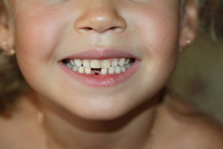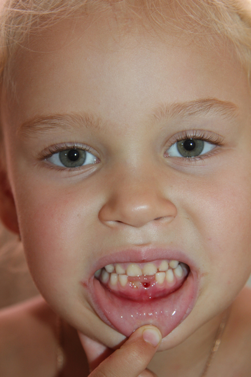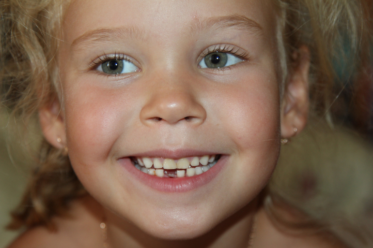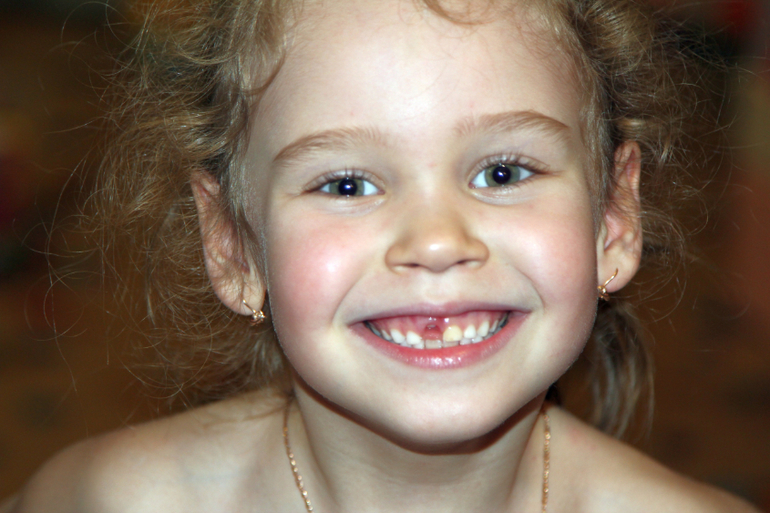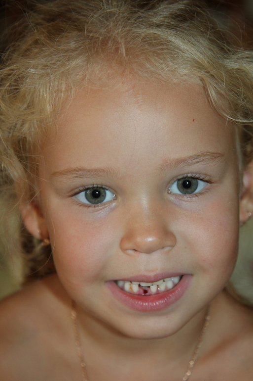 Шатающийся резец на месте, шатается, но она его видно бережет, вот никак и не выпадает.