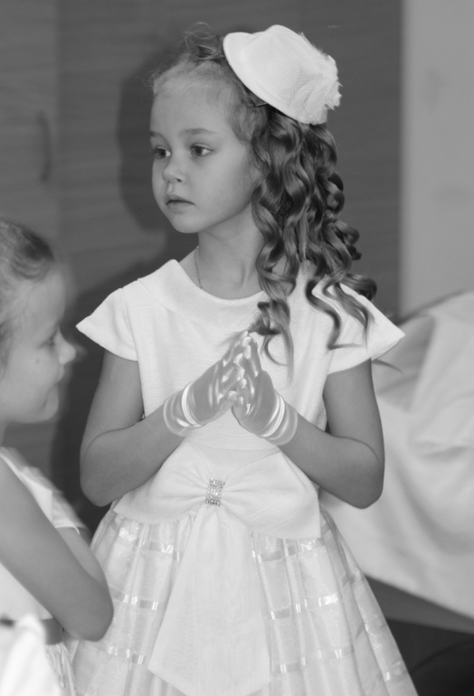 Еще в январе Дашу отобрал музыкальный руководитель как ведущую на хоровое пение. И вот сегодня девочки в белых платьях исполнили Попурри на музыку из"Детского альбома" П. И. Чайковского.