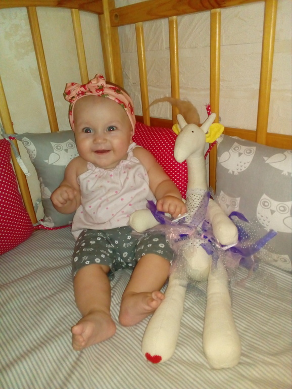 Умеет : самостоятельно садится с четверенек,ползать,стоять у опоры,хохотать и улыбаться😹😹😹 Кушаем кашу,мясные,овощные,фруктовые пюре,творог,фрукты,хлеб,печенье,и ГВ. Режим - 8.00-8.30 подъём