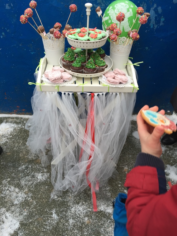 Подготовить сладкий стол (столик, оформление, содержимое) спрятать до поры до времени. Так и не нашла адекватный складной столик, использовали, что было. Сделала юбочку из фатина. Предполагалась сзади растяжка, но скотч на морозе ее не схватил. Оказывается, чтобы он приклеил, на него надо было подышать. Вот. Шарики вокруг столика улетели от ветра. В следующий раз крепить буду иначе и еще сапожки сшитые повешу. Пространство за столиком будем декорировать упаковочной бумагой, с красивым орнаментом.