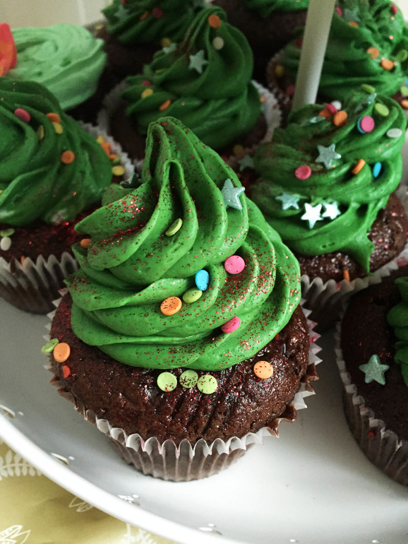 Капы в виде елочек (сами белые, елочка зеленая, украшения красные)