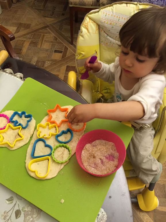 Мы с Софой серьезно подошли к этому вопросу и организовали сладкую корзину (домашние печенья и ватрушки в шоколадной глазури с изюмом, зефирки, сушеные яблоки, курага). Софа мне помогала лепить и украшать сахаром и корицей творожные печеньки. Раскатывала тесто для ватрушек.