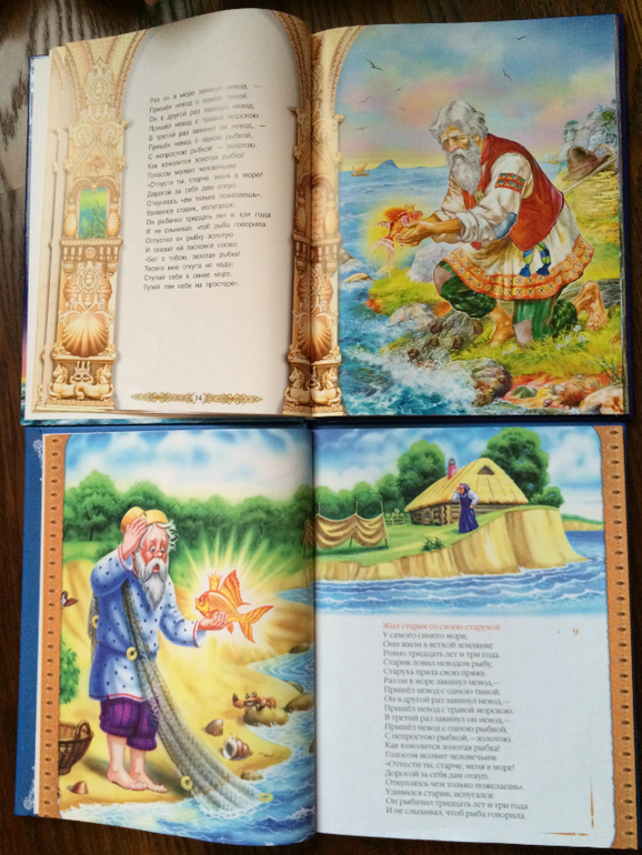 Ну и напоследок две книги со сказками Пушкина. В первой мне больше нравятся иллюстрации, но во второй есть У Лукоморья дуб зеленый... Конечно кто то скажет, что еще рановато ее читать и не все понятно маленькому ребенку, но Сказка о рыбаке и рыбке у нас одна из любимых)