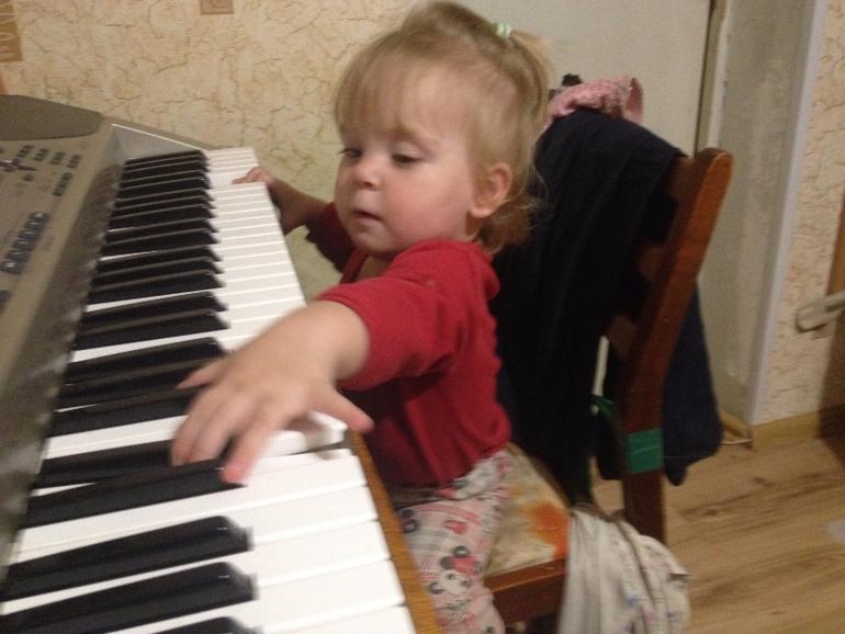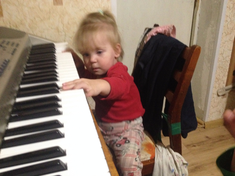 Алиса стала вставать у опоры и делает пару шагов у опоры. За обе ручки ходит по комнате, но как бы пританцовывая. Тоже играет в ладушки, говорит "мама, папа, баба, не," ползает все так же, по-пластунски,играет в мячик (бросает его, если просишь). У Алисы - 8 зубов.