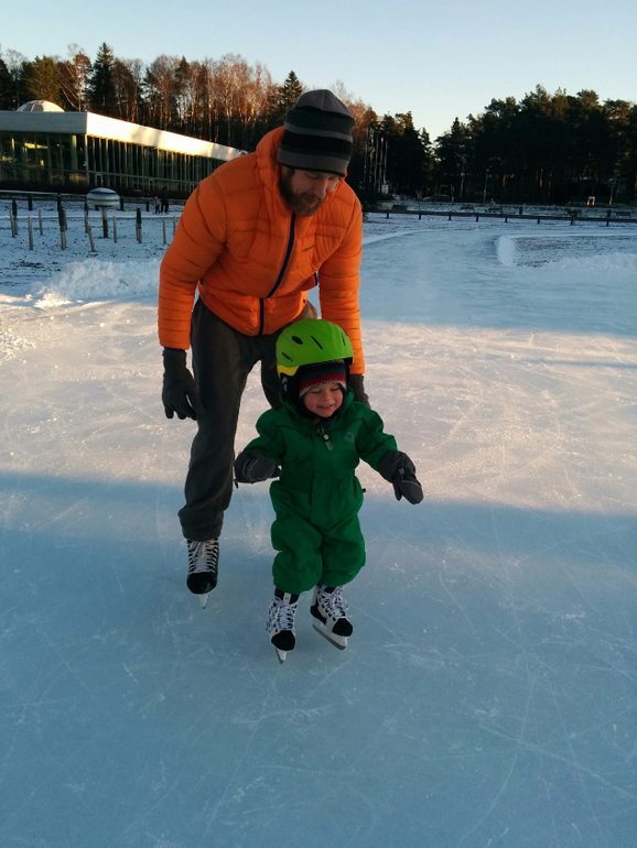 Анют, первые разы он стоять не мог, просто висел на нас, а после раз трёх стал стоять и за ручку идти, но так здесь все рано деток ставят и на коньки и на лыжи.