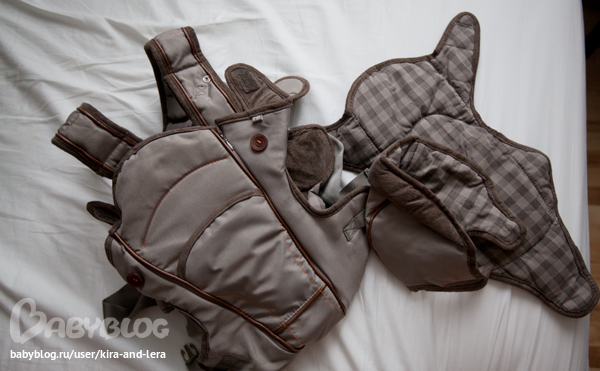 В комплекте с переноской: мягкая прокладка для утепления в холодную погоду, капюшон со стильной подкладкой в клеточку для защиты от дождя и ветра, 2 слюнявчика (удобно крепятся на кнопки, чтобы малыш не поливал слюнями мамину одежду), пластиковый чехол с инструкцией по применению.