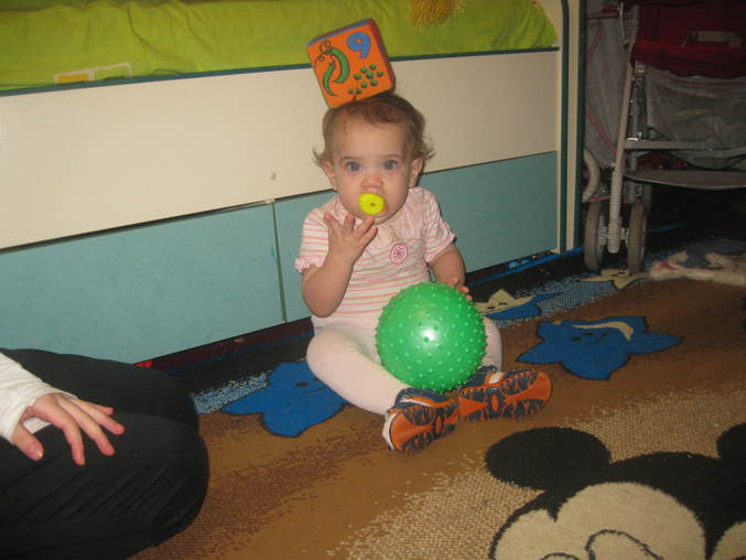 она у нас коляски совершенно не воспринемает-только руки,так мы с крестницей вот в прогулочной дома её приучаем,она тут важничать начала-ну,можете прокатить....мне красный идёт!!!!!!