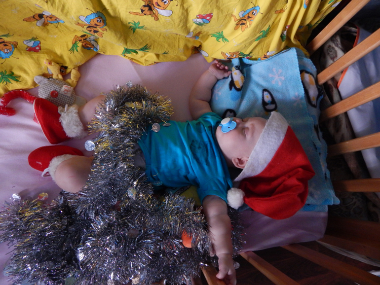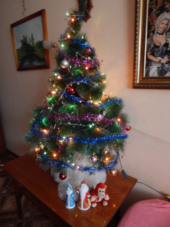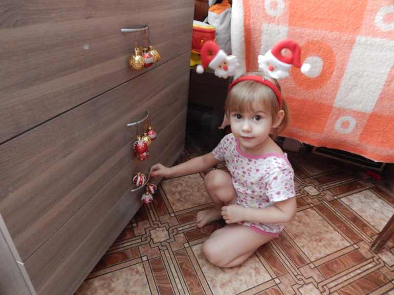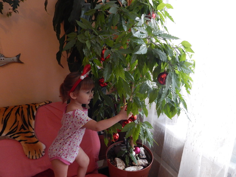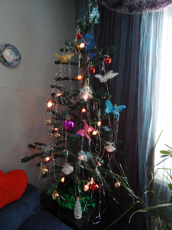 Это пока папа елку собирал) потом сняли, у нас и так и еа пальме мишура и обез'янка и все цветы в шариках)