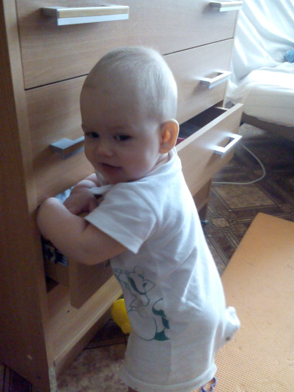 Умеет лихо ползать, стоять держась одной ручкой за опору, ходить вдоль опоры держась одной рукой. Машет пока-пока (Аня начала значительно позже). Еще появилось любимое занятие- открыть комод и разглядывать в нем вещи и перебирать их.
