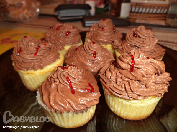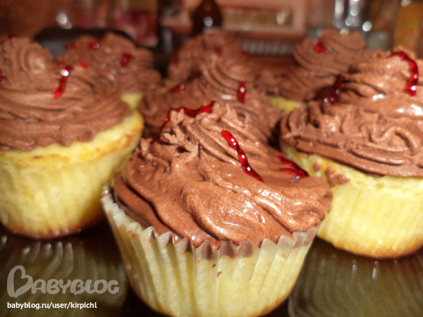 Остался ганаш шоколадный на сливках,торт под мастику покрывала,взбила его хорошенько и на капкейки,правда надо сразу в холодильник,а то тает. украсила пишевым карандаш-гелем.