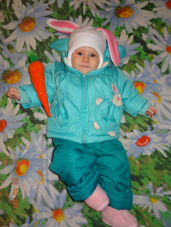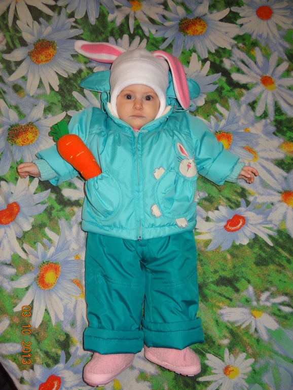 Наконец-то и мы стали обладателями красотени от Киры! Так как нашей Зайке только 6 мес, то фото только в "лежачем" положении :)) Шарфик с варьками ещё не одевали