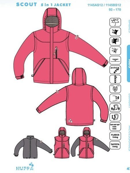 Описание: Куртка 5 в 1, все швы проклеены, рукава отстегиваются, толстая флисовая подстежка, которую можно носить самостоятельно, по низу куртки утяжка, карманы на молнии, на рукавах регулировка липучкой. Вообще, курткой очень довольна, очень! Она красивая, яркая, и не сильно маркая при этом. Носить можно как угодно, флисовая кофточка надежно крепится на кнопочках и молниях по бокам к основной куртке, также реально ее носить как поддеву или просто как отдельный элемент. Курка сама идет как ветровочка, ее можно носить и летом, а поддел флис - на прохладную осень/весну.