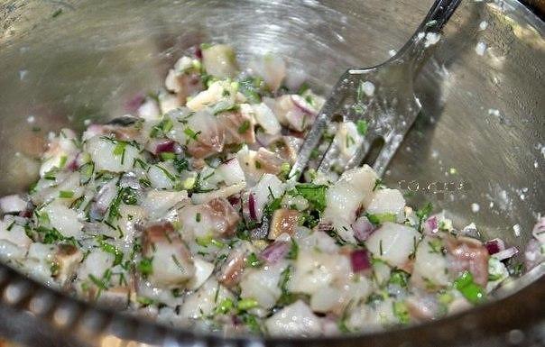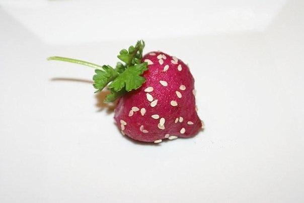 -сельдь с/с 1 шт. -лук синий 1 шт. -зелень укропа -свёкла 1 шт. -картофель 2-3 шт. -сок лимона -оливковое масло -зелень петрушки -кунжут Приготовление: Картофель и свёклу отварить на пару. Очистить, остудить. Свёклу натереть на мелкой тёрке, картофель истолочь в пюре, смешать. Сельдь и лук нарезать мелкими кубиками, смешать с измельчённой зеленью укропа. Из свекольно-картофельной массы сделать небольшую лепёшечку, в середину поместить чайную ложку селёдочной начинки, сформировать "пирожок" в виде клубнички. Из оливкового масла и сока лимона приготовить соус, полить все "клубнички", посыпать кунжутом. Из петрушки сделать "хвостики".
