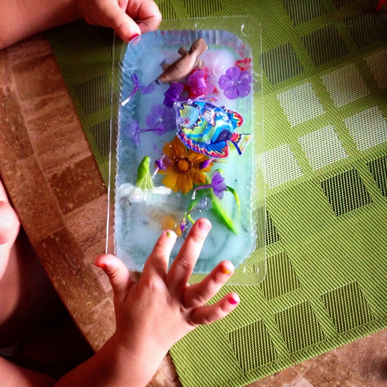 В жару,во дворе или в ванной,ребенка можно занять ледяными раскопками.