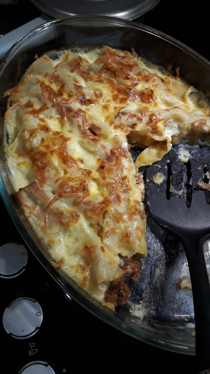 Моя семья и я,очень его любим.Легко, быстро и вкусно.Начинка может быть любая.Кусочки мяса любого,рыба,консервы. Я делала с мясным фаршем и картофелем.