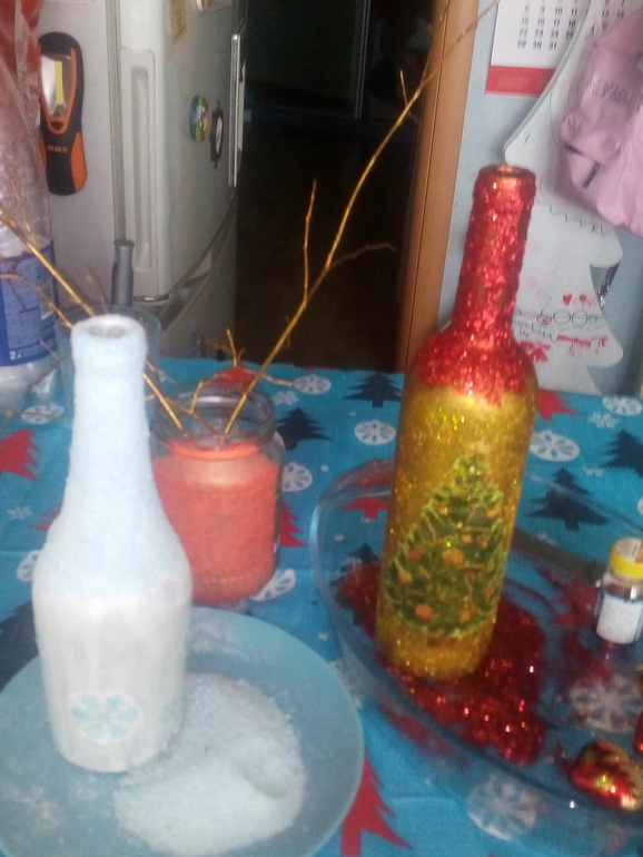 В жизни они поярче. Осталось много блёсток, стразов, красок, решила попробовать задекорировать бутылки. Пока в процессе. Позже покажу, что получилось. Вчера потащила мужа в парк собирать ветки и шишки))) для декора))). С бутылками проблема, клянчу у знакомых)
