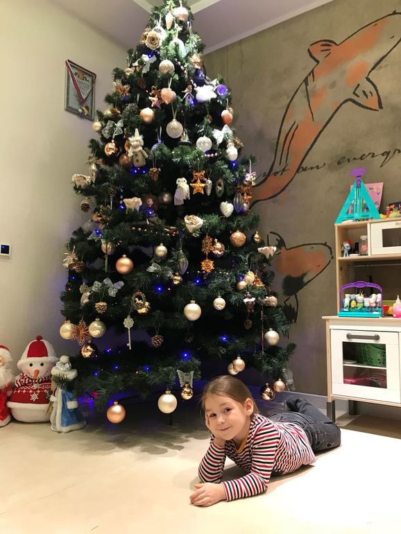 Свою елочку только установили, но ещё не нарядили, а Катя детям давно поставила, в этом году у ёлки новый наряд.