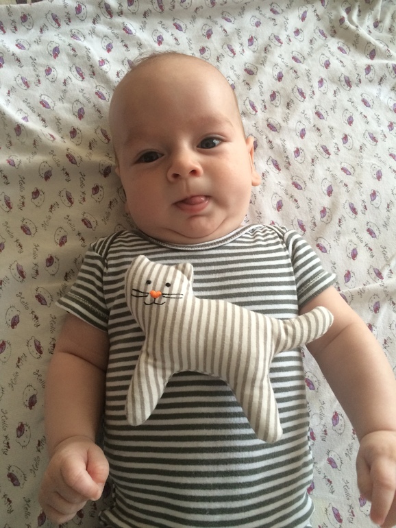 Последнее время любит разглядывать свои руки, ноги, засовывать ноги в рот, пробует на сколько в рот поместится кулак, стал осознанно тянуться к игрушке, чтобы схватить её и потащить а рот. Ну и самое любимое сейчас, это показывать всем свой малюсенький язычок. Вот такой у нас озорник! (Через неделю будет 4 месяца)