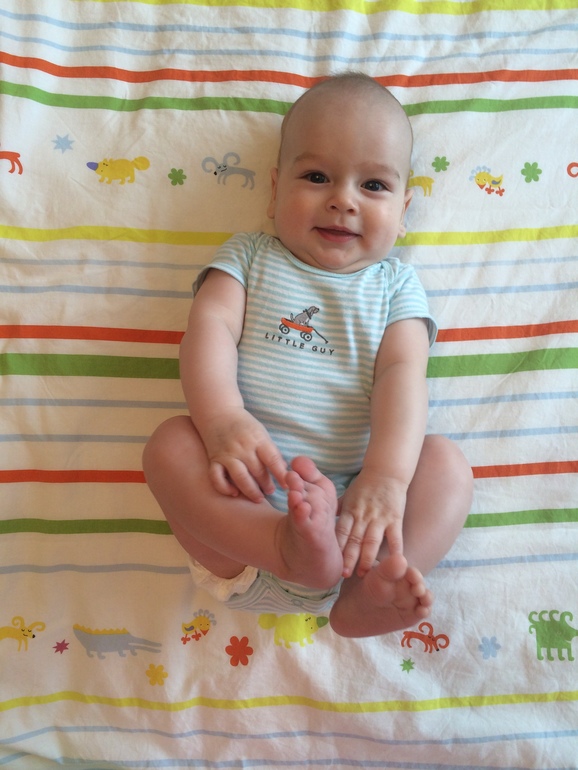 Переворачивается больше влево, правая сторона хоть и помассирована, но все равно он ленится. Руками все хватает, все в рот тянет. Рукава постоянно мокрые, он их оттягивает и сосет. Тоже и с носками, или снимет их и в рот или мысок ползунка лежит насасывает. У нас в кроватке кармашки для игрушек висят, он ногами снизу по ним бьет и игрушки выпрыгивают, нашёл себе развлечение. И так лежит, пыхтит, старается и все все игрушки повынимает.