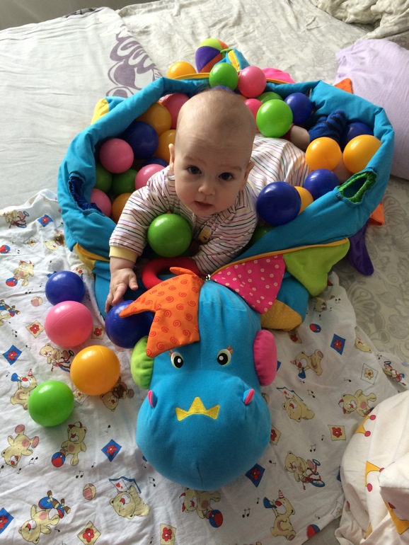 Переворачивается очень хорошо. Пальцы ног сосет))) Передвигается вокруг себя и ползёт на животике. На коленочки приподнимается на пару секунд и плюхается на животик. Сесть не спешит, и я не сажаю, время придёт сам все поймёт и сделает как надо. Любит прыгать, просто заяц какой-то.