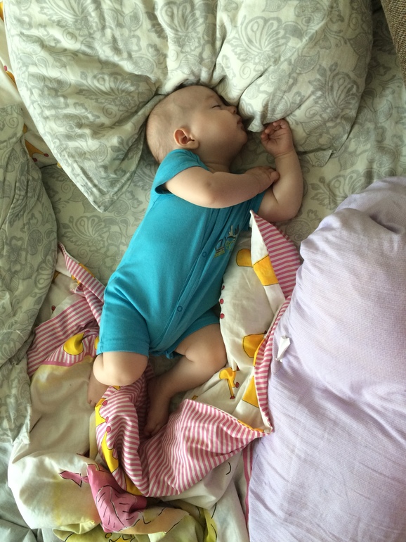 Раньше Саша тоже на спинке часто спал, потом научился на живот поворачиваться и полюбил спать на животике, а сейчас вот так любит спать. Переменчивый парень. Если спать на левом боку, то быстрее отходят газики, может поэтому ему так удобно.