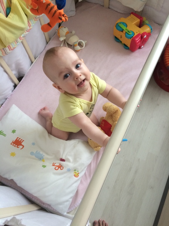Сидит на бедре, в коляске подтягивается и салится как взрослый. Ползать хорошо научился, может из комнаты в коридор, и в другую комнату уползти. Встает на коленочки и держится ручками за чтото, на ноги встать пробовал, но упал, больше попыток не было.