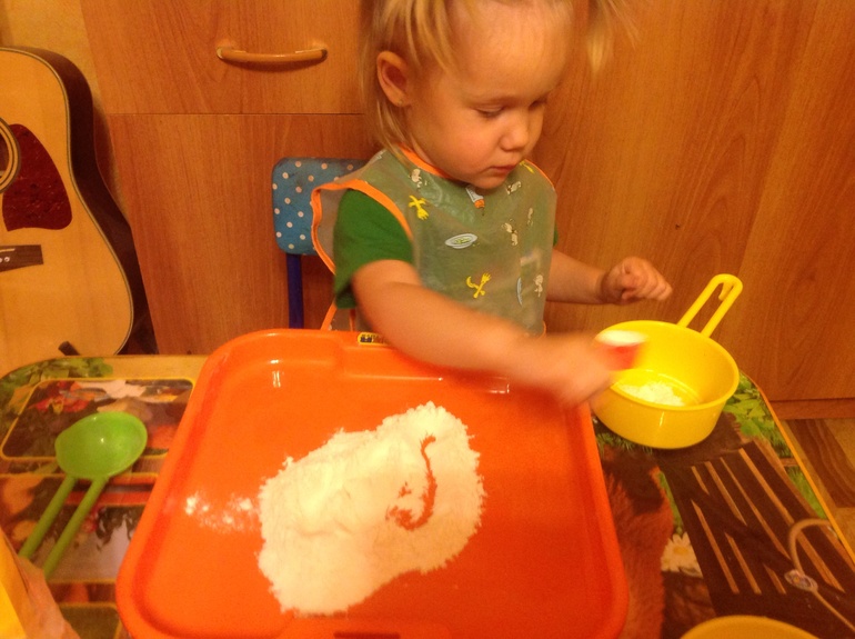 Прочитали Колобок, взяли муку, стали играть. Рисовать на муке не захотела, пересыпала только.
