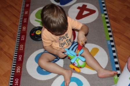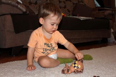 Очень нравится ему «ковыряться» с ключиками, отверткой, монетки любит в копилку собирать, ну и т.п. занятия.