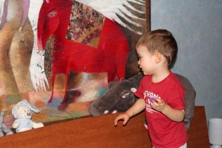 Иногда карандашами может накалякать что-нибудь и все L Зато готовые картины изучает, вот недавно новую картину пытался восковым мелком «поправить»: