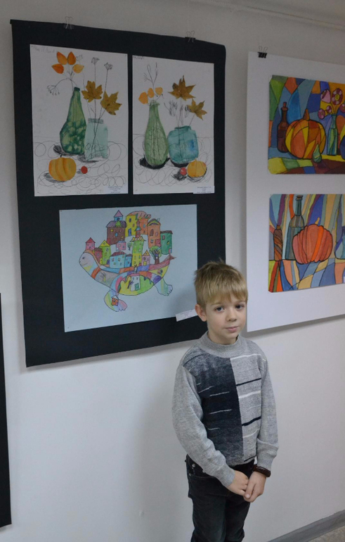 Еще отдали его в художку не столько из-за его интереса рисовать (очень не любил это в садике), а чтобы руку к письму лучше развить. Но на наше удивление его заинтересовали так, что он теперь бежит туда так, что только пятки сверкают. Даже в декабре приняли участие в выставке. Вот немного из его работ.