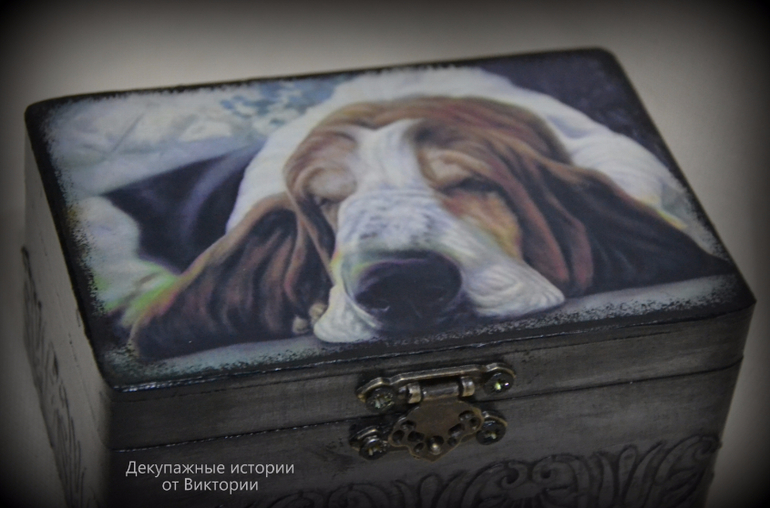 После появления в нашем доме Изумруда - наш круг общения расширился. В нем появились любители бассет-хаундов. И вот по заказу была сделана данная шкатулка с фото любимца хозяйки шкатулки. Фото было не очень хорошего качества (спасибо Наташе за помощь в обработке), поэтому решили по максимуму отвлечь внимание от фото на саму шкатулку, поэтому добавила украшали, ножки (как у бассета :))