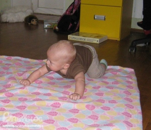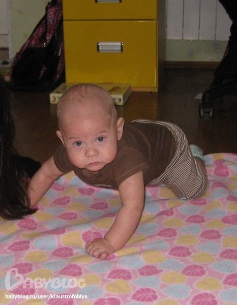 Пока только прыгает, передвигается как гусеница, вот с такого положения (см. фото) и уже очень уверенно становиться на червереньки. Умничка моя маленькая!!! Девочки, а у кого еще детки так стоят? И как пытаются ползать? Мой иногда задом передвигается.