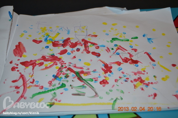 Ну скажем так сегодня уже есть прогресс, Катя дома рисовала красками минут 20 или 30!!!!!!!! поверьте для нас это реально прогресс! пальцами не любит рисовать. няня придумала макать ухочистками и ей понравилось! вот наш шедевр