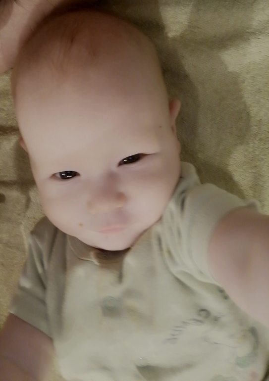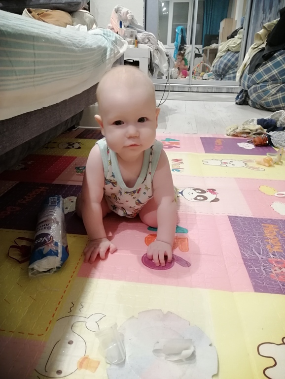 За этот месяц Саня начал ползать по всей квартире, но только по пластунски. Научился сам садиться. Теперь длползает до чего нужно, садится и рассматривает, играет(к слову игрушки у нас по всей квартире разбросаны) Ему теперь всё нужно, чего бы он не увидел. Кошачий корм? давай сюда! О, замороженная индюшачья нога стоит на столе! И её давай! Требует очень голосисто. Приходится утаскивать его с кухни, а он ползёт обратно и всё по новой 🤦♀️