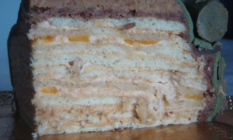 Торт молочный с карамельным кремом, персиками и орешками кешью (Мишкины любимые), вес торта 2,7 кг, обошелся нам в 2100 руб.