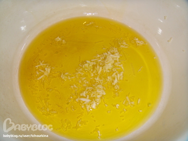 Дальше делаем смесь: натираем 4 зубчика чеснока в миску, заливаем оливковым маслом: