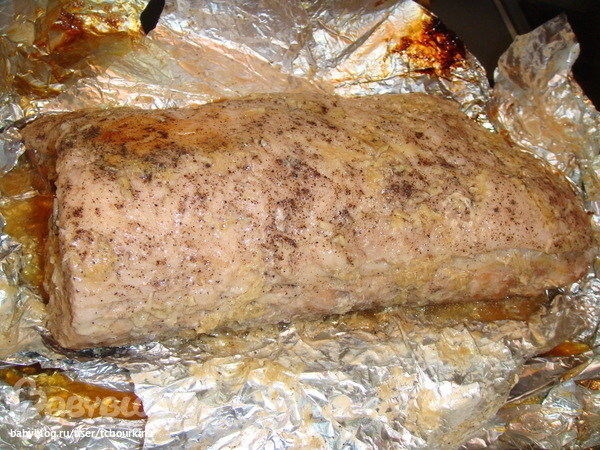 Потом натертым чесноком натерла мясо со всех сторон, посолила и поперчила крупным черным перцем. Завернула в фольгу и отправила на 2 часа в духовку: