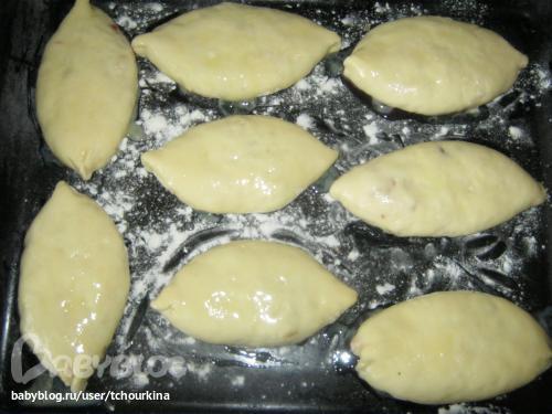 Затем на доску подсыпать муки, разложить небольшие комочки теста. Разминаем комочек рукой в лепешку, кладем начинку. Раскладываем пирожки на противень, даем подойти, смазываем разбитым яйцом: