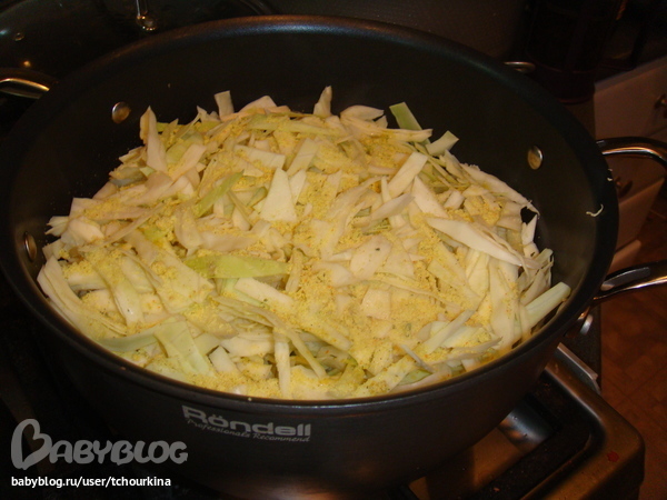 Капусту с луком потушить на растительном масле с добавлением бульонного кубика и сахара: