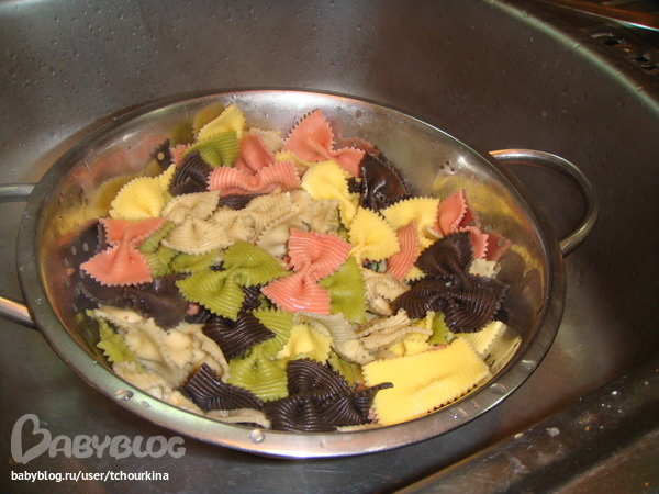 На ужин мы варили итальянские макаронки-бантики. Они цветные (сок свеклы, чернила каракатицы, морковный сок и шпинат):