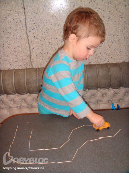 Для маленьких машинок я из зубочисток делаю Вове на столе дороги:
