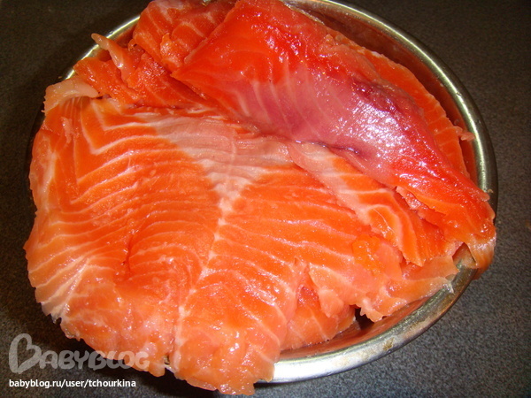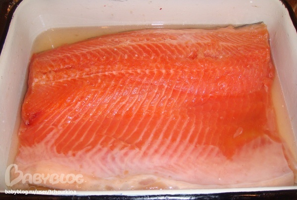 В магазине купила огромную свежайшую форель. Голову, хвост, плавники и кости пустили на уху. Филе на коже засолила по любимому рецепту: на каждый кг рыбы 1 ст.л. крупной соли, 2 ст.л. сахара, 3 ст.л. водки. По желанию можно добавить мелко рубленный укроп, но я в этот раз без него делала: