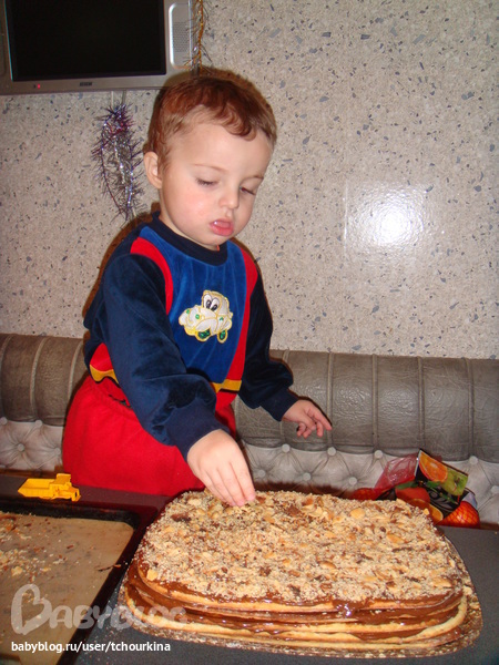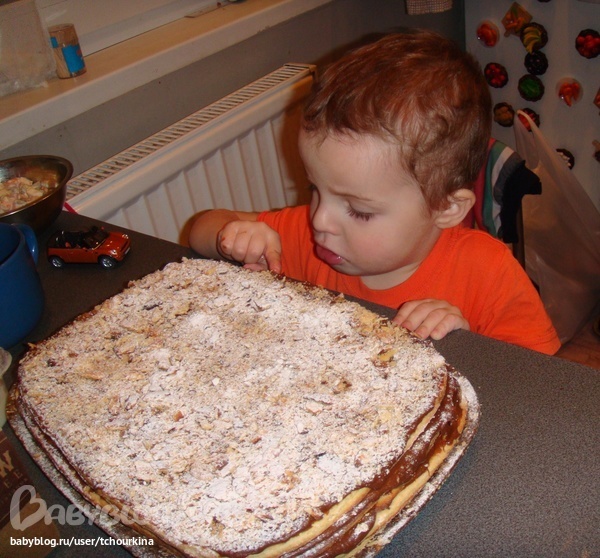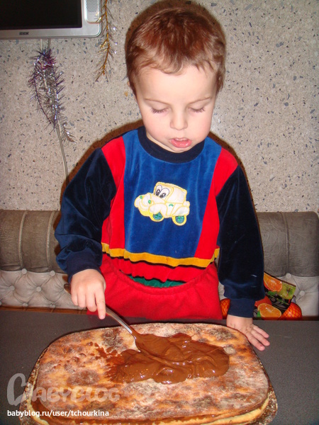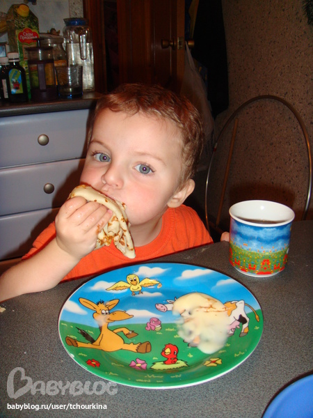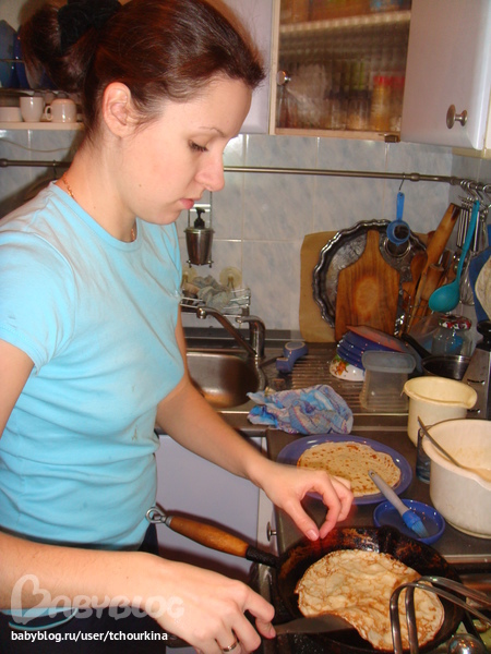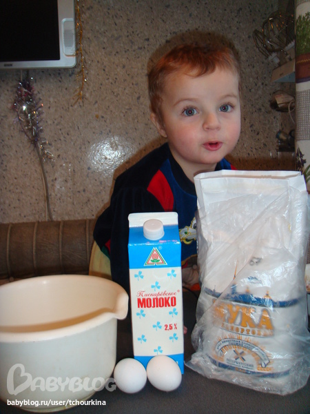 Еще мы, конечно, с Вовой готовили. Для блинчиков третье поколение нашей семьи использует такой рецепт: на 2 яйца пол литра сырого молока, 1 ст.л. сахара, на кончике ножа соли. Муки столько, чтобы тесто было жидкое как кефир.